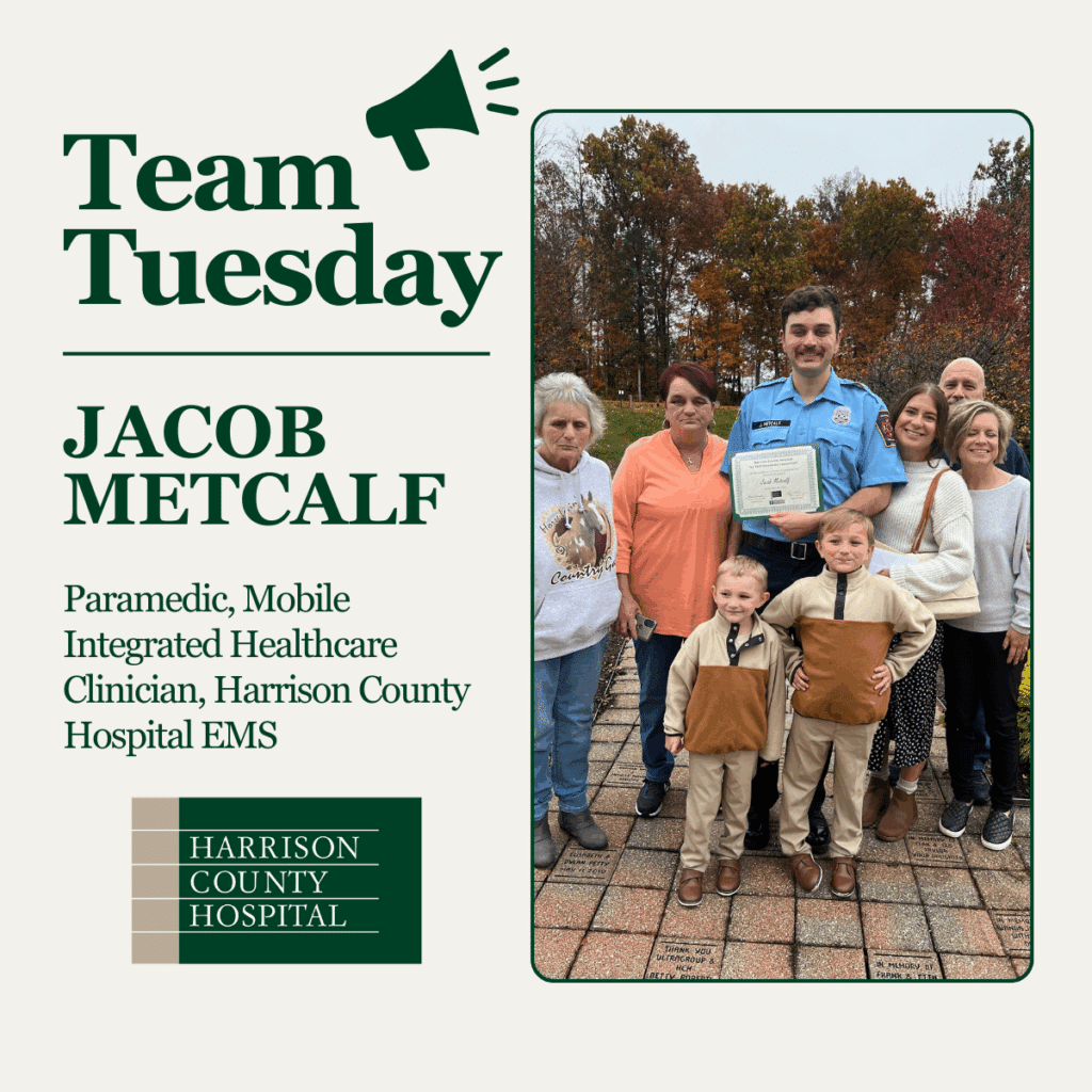 Jacob has been a Paramedic with Harrison County Hospital EMS for four years, and has recently been named the new Mobile Integrated Health Clinician. Jacob’s favorite part of his career is making connections with patients and helping them during their worst time.