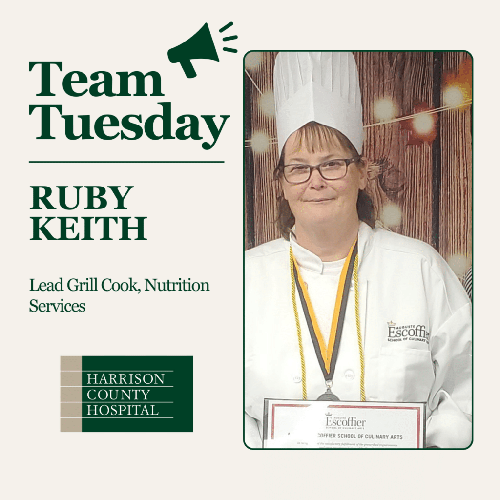 Ruby has been part of the Nutrition Services team at HCH for 16 years! Ruby is a lead grill cook and she serves our customers (hospital staff and visitors) by preparing grilled and made-to-order meals. Ruby holds an associates in pastry and is working towards an associates in food entrepreneurship.