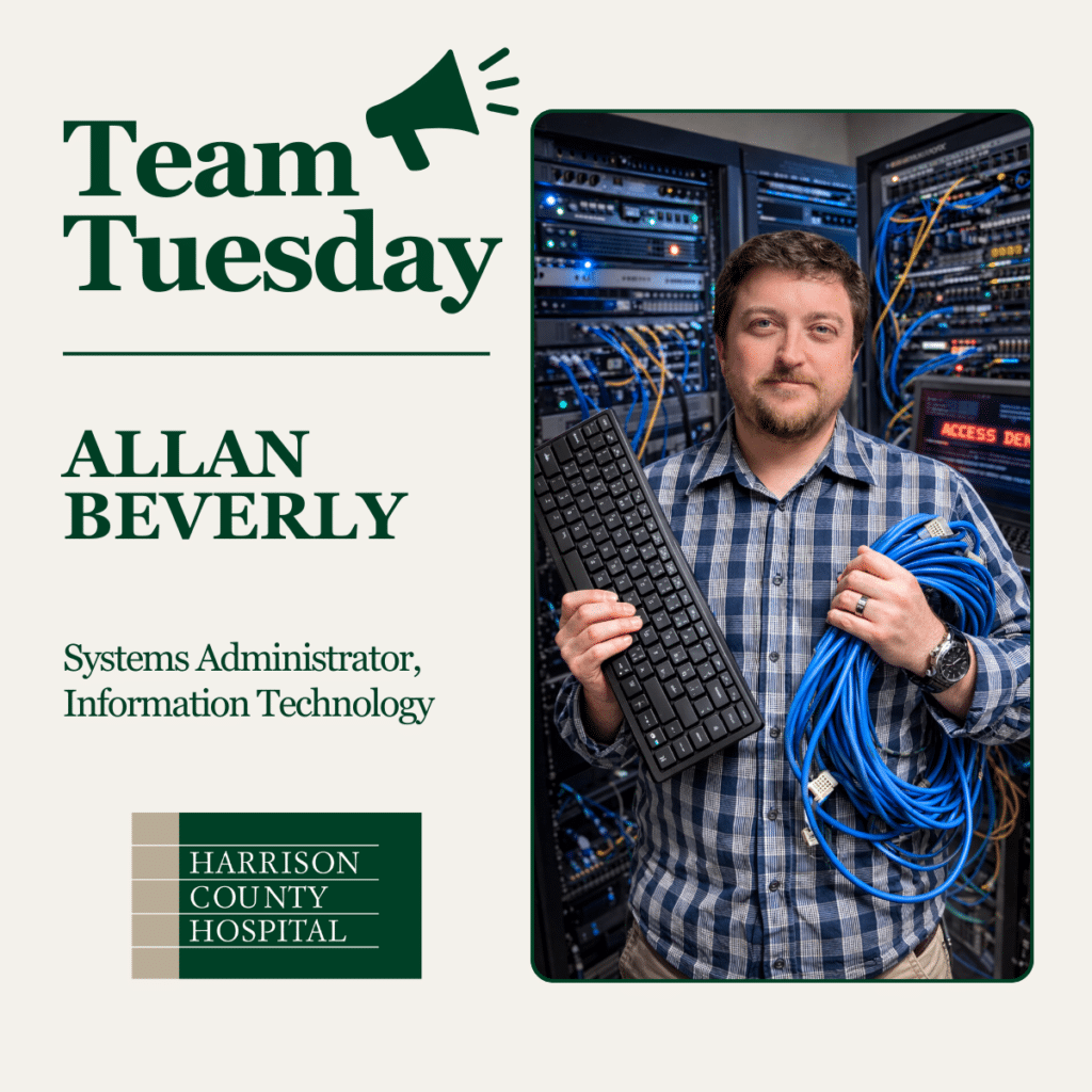 Allan will celebrate his second anniversary with Harrison County Hospital this April. Allan is a Systems Administrator in the Information Technology Department. In his own words, Allan manages the servers and backend data systems for the hospital and supports our other IT employees. Allan enjoys finding new ways to make systems run better and ensuring that nobody has to think about whether their data is secure.