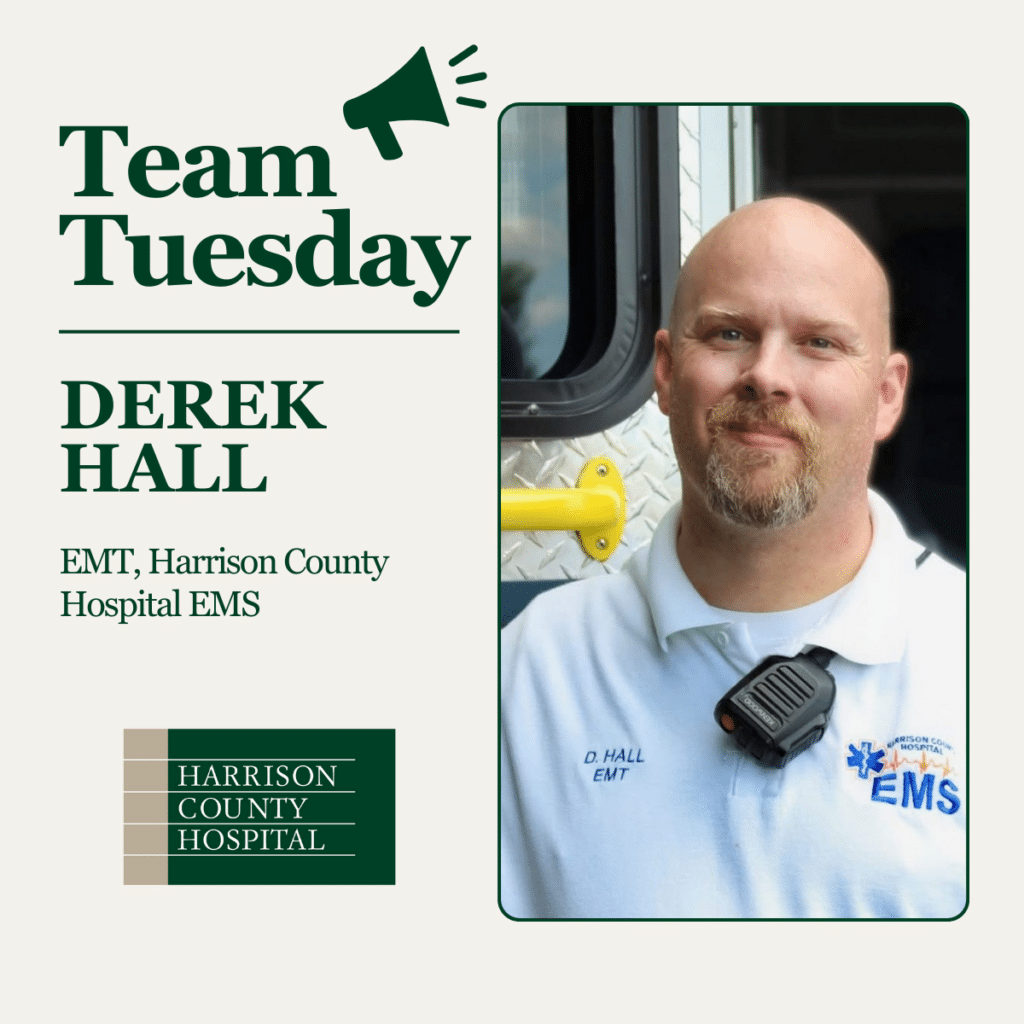 Derek Hall has been an EMT with Harrison County Hospital EMS for three and a half years. As an EMT, Derek treats sick and injured patients while providing the most effective care. Derek refers to his career as “a passion. EMS isn’t just a job that pays the bills.”