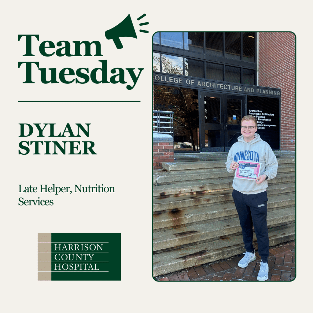 Dylan, a Late Helper in the Nutrition Services department, has been with Harrison County Hospital for three and a half years. Dylan assists with several jobs throughout the department in order to provide customer and patient satisfaction when it comes to their dietary needs and wants. Dylan said that his favorite part of his job is being able to have fun times with his co-workers while also being productive!